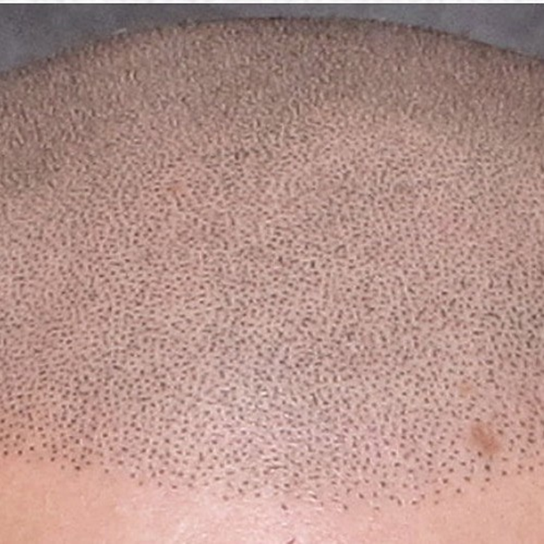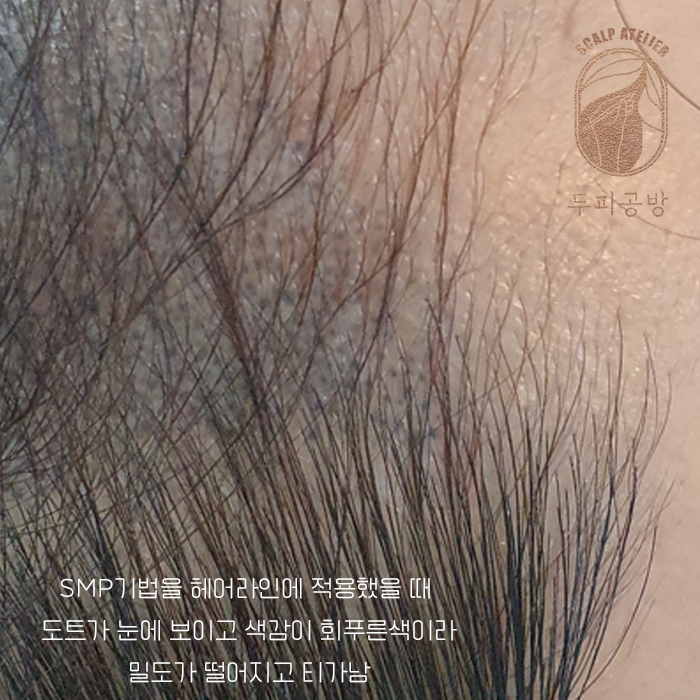 SMP 기법으로 헤어라인을 적용했을 때 도트가 눈에 보이고 색감이 회푸른색으로 변색되는 경우가 많습니다.